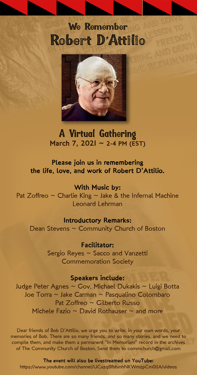 Read more Video Recording of Memorial Celebrating the Life of Bob D'Attilio04/06/2021 [NEWS] - For those who couldn't attend the memorial for Bob D'Attilio, here is the video recording of the nearly 2 hour event. Some of the participants include Gov. Michael Dukakis, Judge Peter Agnes, writer Luigi Botta, novelist Joseph Torra, musicians Jake Carman and Charlie King, Dean Stevens from CCB, labor organizer Pasqualino Colombaro, Pat Zoffreo, Prof. Michele Fazio, playwrighter David Rothauser, and Leonard Lerhman.