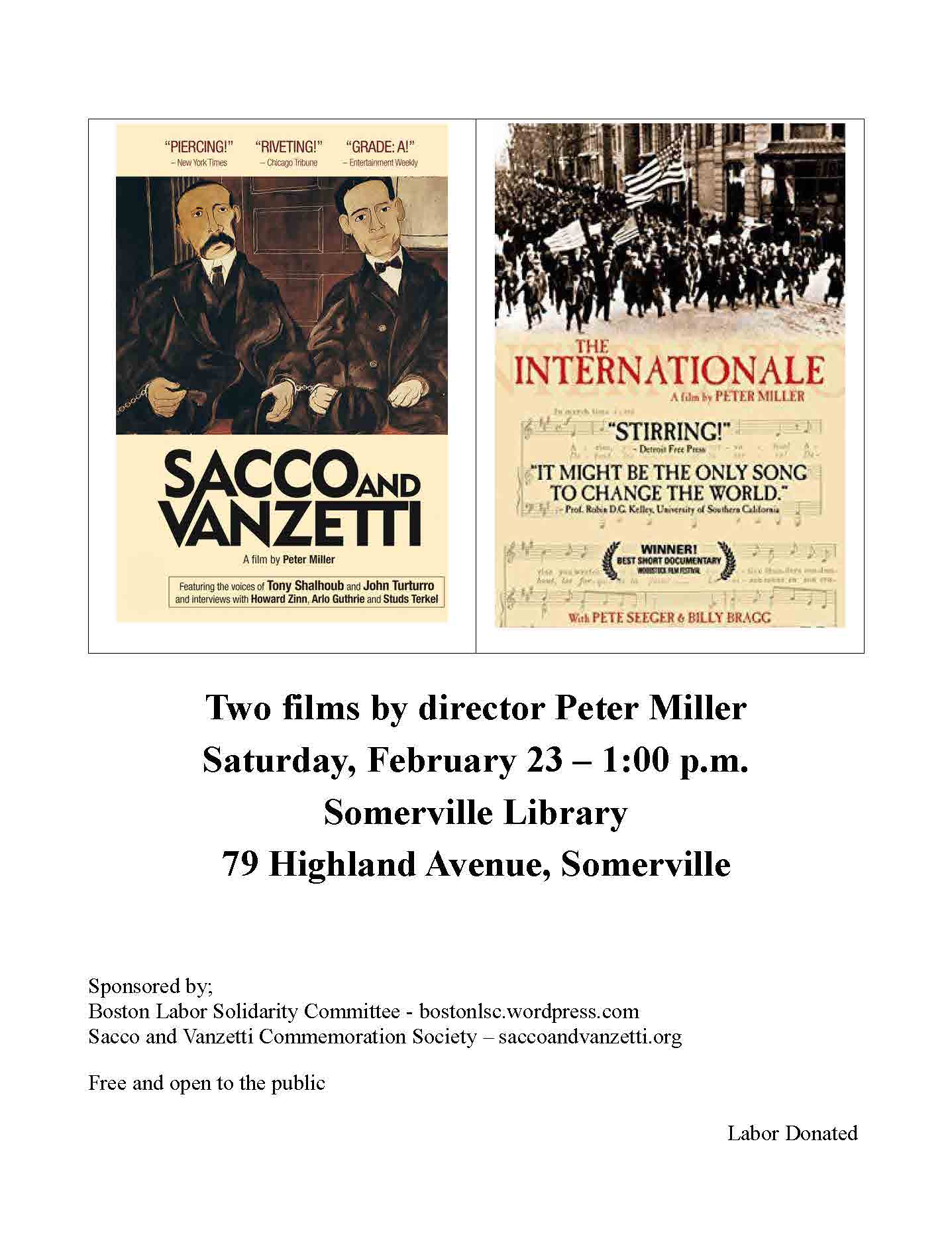 Read more Two documentaries by Peter Miller to be shown at the Somerville Library: Sacco & Vanzetti and The Internationale. "Sacco and Vanzetti" and "The Internationale", two films by director Peter Miller. Saturday, February 23, 2019 - 1:00 PM, at the Somerville Library, 79 Highland Avenue, Somerville.