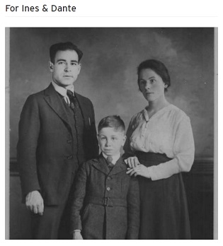 "For Ines and Dante" was composed by Joe DeFilippo and performed by the R.J. Phillips Band, a group of Baltimore musicians. The band includes Joe DeFilippo: vocals, piano, bass guitar; Patrick McAvinue: fiddle; Bill Pratt: drums, organ. Orchestral arrangement by Bill Pratt. The song was produced and recorded by: Bill Pratt @ the Bratt Studio, Baltimore, Maryland.