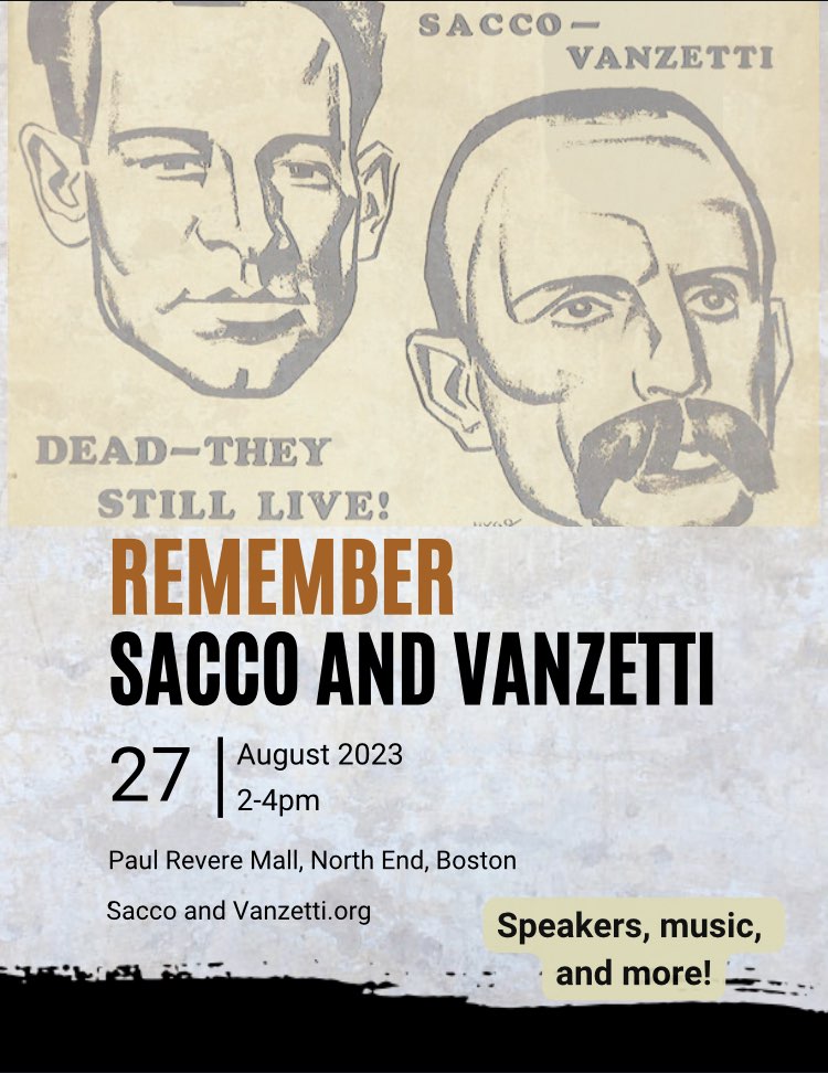 NEWSRemember Sacco and Vanzetti Sunday, August 27, 2023, 2-4 PM at the Paul Revere Mall, North End, Boston. We will remember the lives, struggles and death of Nicola Sacco and Bartolomeo Vanzetti, executed by the Commonwealth of Massachusetts on the electric chair at the Charlestown State Prison on August 23, 1927.