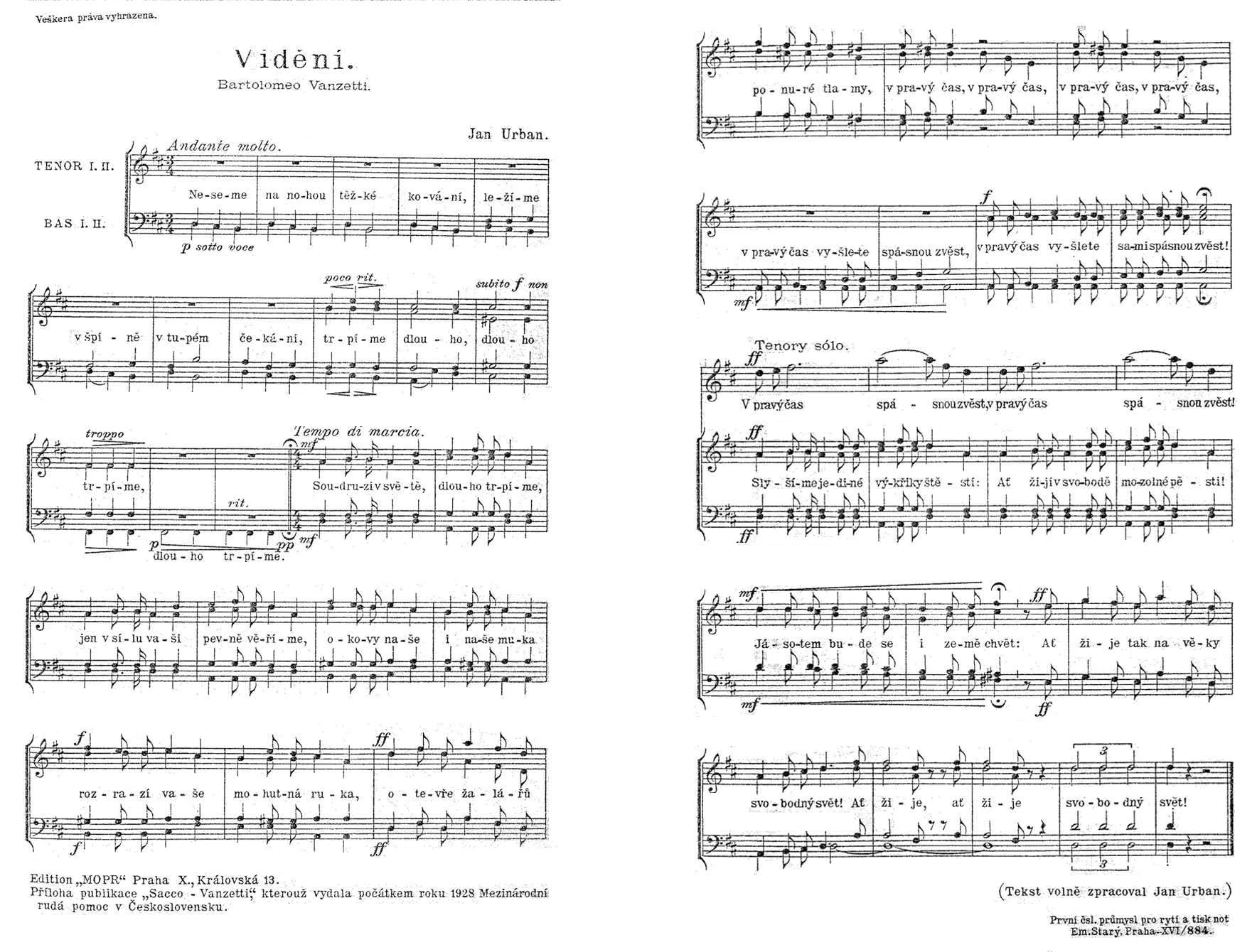 Videní - Bartolomeo Vanzetti. Music by Jan Urban. Words of Vanzetti loosely translated into Czech by Jan Urban. Taken from Sacco-Vanzetti. Pametní list Mezinárodní rudé pomoci Ceskoslovenska k vyrocí bostonské justicní vrazdy z 22. srpna 1927, compiled by Jan Urban (Prague: Edice MOPR, 1928). To see a higher res graphic image of the sheet music click here. Below is a rough translation of the song: Vision We carry heavy leg chains and are lying in the dirt, exhausted and waiting, We are long long suffering, long suffering. Comrades of the world we have suffered long and truly believe only in your mighty strength will our leg chains and our suffering be eliminated and release us all from the darkness of prison at the right time. At the right time, at the right time, at the right time, at the right time send us a message of salvation, At the right time send us a message of salvation! At the right time send us a message of salvation! We hear the shouts of happiness: Long live calloused hands in freedom! Even the world will shake with rejoicing: Long live, long live the free world! Woody Guthrie - Ballads of Sacco & Vanzetti. Commissioned by Moses Asch, 1945; composed and sung by Woody Guthrie 1946-47; originally issued in 1960 on Folkways FH5485. The CD includes 12 songs: 1. The flood and the storm 2. Two good men 3. I just want to sing your name 4. Red wine 5. Suassos lane 6. You souls of Boston 7. Old judge Thayer 8. Vanzetti's Rock 9. Vanzetti's Letter 10. Roo hog and die 11. We welcome to heaven 12. Sacco's letter to his son (by Pete Seeger)
