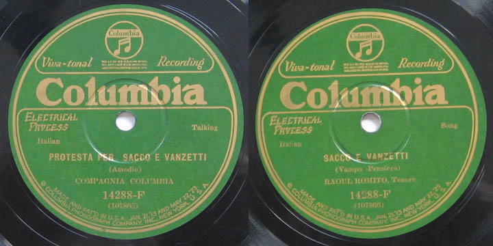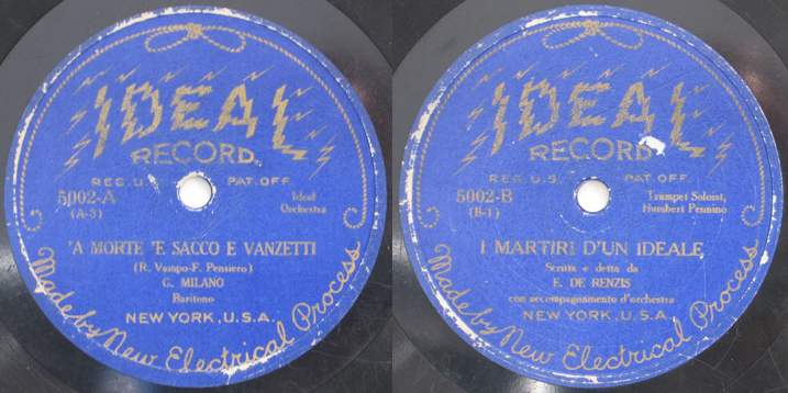 Written by Frank Amodio, and performed by Compagnia Columbia. Translation: A: Hey, what’s this crowd doing here? B: How can you not know? It’s an assembly for Sacco and Vanzetti. A: Oh, those poor guys who have been condemned to death? B: Yeah. But now we’re trying to save them. A: But those two, people told me; I know they’re guilty of murder! B: And you believe it! They say they didn’t even steal anything. A: Not even the robbery? C: Come on; enough! Stop saying dumb stuff. Those two poor guys haven’t done anything wrong. A: Oh, well. What do I know, for heaven’s sake? They told me what they’re accused of and I am just repeating it. D: Well, then why are they condemned to die? C: Oh, my friend. Who knows how many innocent men have been condemned like them?! A: Poor fellows! B: But, I mean, is there nothing one can do to save them? C: It’s for them that there are all these demonstrations and protests. A: Listen, it’s really a sin to send fathers with families to death for no reason! B: Oh, sure! A: Oh, we must hope for the grace of the Madonna. C: Forget the Madonna! We must be the ones to fight and save them. Even more because they are Italians like us. B: Oh, come on. It has nothing to do with who is Italian or American; when someone is innocent we should help them always. A: You’re right! B: Hey, shut up! Shut up! They’re starting to talk. A: Quiet! E: Friends, you already know what has brought us together here, and I am happy to see in this solemn moment a crowd made up not just of Italians but of people of all nationalities: Italians, Americans, Jews, English, Japonese. At this fatal hour we have come together to form a single race: the human race! With no differences based on age, on class, or on party. VOICE: Bravo! E: And we are here to support a holy cause, to save to of our brothers who because of a judicial error are condemned to die in the electric chair. We must protest energetically against this unjust condemnation. Yes, unjust! Because we all know that at the moment of the tragedy the two poor condemned men were far from the scene of the crime. I remember now the last question that the judge asked the two men: “Don’t you have anything to say after having been sentenced to the electric chair?” And the answer was, “Yes, we must say that we are innocent!” And they are innocent! And now, gentlemen, raise your voices in protest. If Sacco and Vanzetti go to their deaths, what will the law be committing? Crowd: An injustice! E: And what are the condemned men? Crowd: They are innocent? E: What are Sacco and Vanzetti waiting for? Crowd: For a pardon! Translation by Siân Gibby Thanks to Joseph Sciorra. For more info see his article, "The Sound of Italian American Protest," at this link. Written by Renzo Vampo, Composed by F. Pensiero, and sung by Raoul Romito. Recorded May 1927. Sacco e Vanzetti Sacco e Vanzetti furono arrestati a Boston una sera con sorpresa, d'avere ucciso furono accusati e pel verdetto furono in attesa. Ma tutto il mondo insorse a tale atto e piu di un dibattito passo, per fare almeno luce sul misfatto, ma tutto invan, la legge condanno! Se ne son spesi dollari sperando di salvar quegl'infelici uomini da dubbia reita. E Sacco disse: "Noi siamo innocenti, e chi ci condanno lo sa pur bene, ci han calcolati come delinquenti stringendoci piu forte le catene. Se il nostro fine in questo caso nuoce di classe e l'odio che fa condannar, mentre nel mondo intero una voce s'innalza per poterci liberar. Ed ho finito, disse, Vanzetti, parlera, io fin non mi so esprimere, egli continuera". Vanzetti, l'altro martire, parlando con voce calma e senza aver paura, discusse quel delitto piu nefando e pur l'orror della condanna oscura. Ai giudici egli disse: "Condannate! Rimorso atroce avrete voi un di". Le nostre idee, e ver, sono avanzate ma non per questo noi dobbiam morir". Il mondo guarda e attende e grida ognor cosi: la sulla sedia elettrica non debbono morir! Translation Sacco and Vanzetti were arrested, by surprise in Boston one night, they were accused of murder and they were awaiting the verdict. But the whole world rises up against this act, and many discussions took place, trying at least to shed light on the wrongdoing, but all in vain: The law found them guilty! Much money was spent hoping to save These poor men from this spurious charge. nd Sacco said: “We’re innocent, and those accusing us know it very well, they figured us for criminals pulling the chains tighter around us. If our fate in this case his death, it’s class hatred that condemns, while throughout the world a voice calls out to try and free us. “And I’m done,” he said, “Vanzetti, he’ll speak; I don’t know how to conclude my speech. He’ll continue.” Vanzetti, the other martyr, speaking in a calm voice and with no fear, discussed that most heinous crime and also the horror of the dark verdict. To the judges he said, “Condemn us! One day you’ll feel a terrible remorse. It’s true, our ideas are advanced, But we shouldn’t have to die for that.” The world watches and waits and even still cries out, saying: They shouldn’t die on the electric chair! Translation by Siân Gibby Thanks to Joseph Sciorra. For more info see his article, "The Sound of Italian American Protest," at this link.